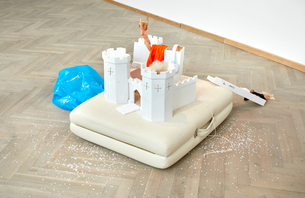 Til Forårsudstillingen havde årets kuratorer, kunstnerkollektivet coyote, valgt et bidrag af 1000 x Dorthe I’m a Barbiegirl in a Horrorworld – en anonym kunstnergruppe, som mødtes på et krisecenter for voldsramte kvinder. Den sælsomme, ekstremt voldsomme installation, Jul på krisecenteret (2024), indtog et helt rum i kunsthallen og bestod af elementer fra et midlertidigt hjem i krisen: Et væltet pamfletstativ, en legeborg fyldt med glimmer og Barbie-dukker, en plantegning over en lejlighed, en projektion med en gigantisk lædersofa. På et personligt og æstetisk plan var den installation noget af det mest originale, vi har oplevet i Danmark længe.