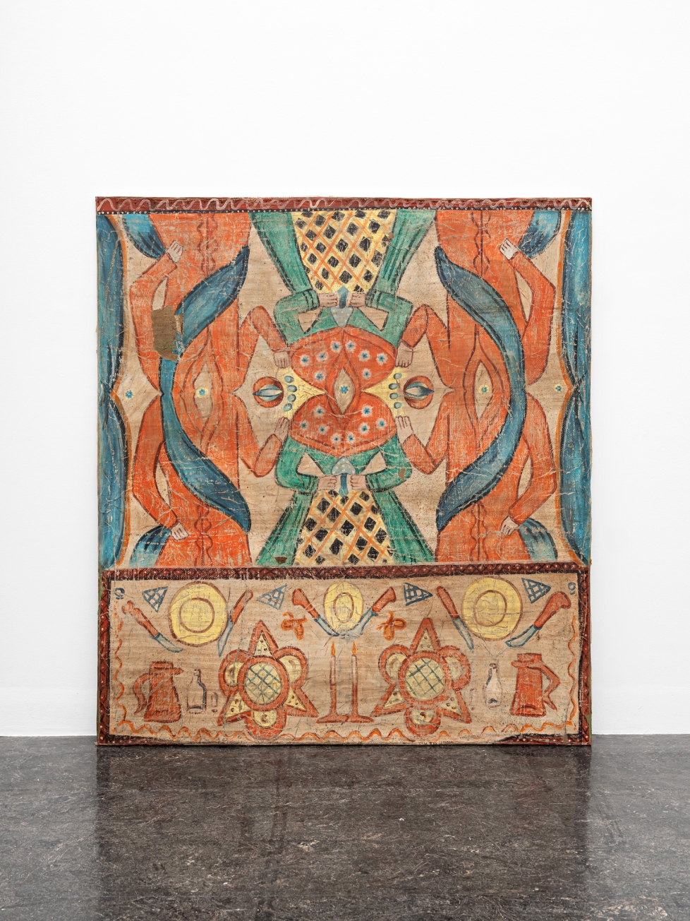 Jeg liker juryerte gruppeutstillinger som Høstutstillingen mer og mer. Kunsten har ikke i oppgave å være stillas for store tanker, og helheten kommer etter det som henger på veggene, bare holdt provisorisk sammen av linjer i det utstilte materialet som man ikke en gang nødvendigvis får med seg. Det skaper en mindre kontrollert atmosfære som gjør omgangen med arbeidene lettere på fot. Jeg hang meg opp i Martin Stråhles Äta svamp: en passe slepphendt middelalder-psykedelia manet frem på jutevev med sparkel, lim, benmel, pigment, rustbeskyttelsemasse, skjellakk oa., som slo et metaforisk hull i veggen og tiden. Jeg forter meg med en myntning: alkymisme.