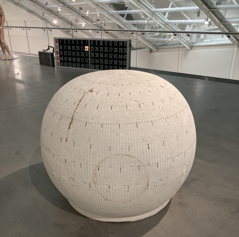 Udstillingen med 50 års værker af Lutz Bacher var heldigvis heller ikke underkastet nogen funky formatering. Det var ’bare’ de rå værker præsenteret lidt hullet, lidt i klumper, nogle gange også lidt stramt, på en balanceret, men heller ikke for ydmyg måde. Et par udstoppede jeans, eller en stor, lidt vandskadet polystyrenkugle, måske indmaden fra noget, der engang spillede rollen i en scenografi. ’Readymades med patina’, som kuratorerne kaldte det på det fremragende udstillingsseminar. Ikke readymades for at vise, at alt kan være kunst (Duchamp) eller at alt er varer og transaktioner (90er-00ernes kunst), men for at bringe en destabiliserende affekt ind i tingene. Skamløst, beskidt, eller sentimentalt. Gulvet gynger under beskueren, mens Bacher går langt uden om plottet – medmindre, selvfølgelig, det kan fungere som en stor, fed vittighed.