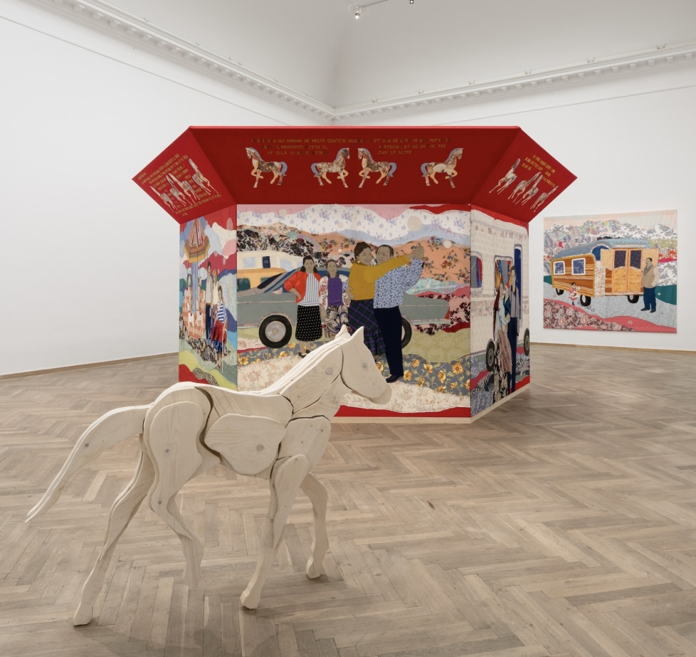 Midt i rummet står en sekskantet installation, der helt tydeligt låner form fra karrusellen, med store farverige tekstilværker på alle sider. Motiverne tager udgangspunkt i fotografier og arkivmateriale om sinti-samfundet i Italien; en undergruppe af romaer, der historisk set har beskæftiget sig med omrejsende forlystelser. Her er billeder af smilende familier foran deres beboelsesvogne, i mønstrede stuer og i nærheden af de dyr, de har levet med. Det ser eventyrligt ud, som billeder fra en børnebog om livet på farten, fuld af magi og af den forbundethed, der opstår, når man bor og arbejder tæt sammen.