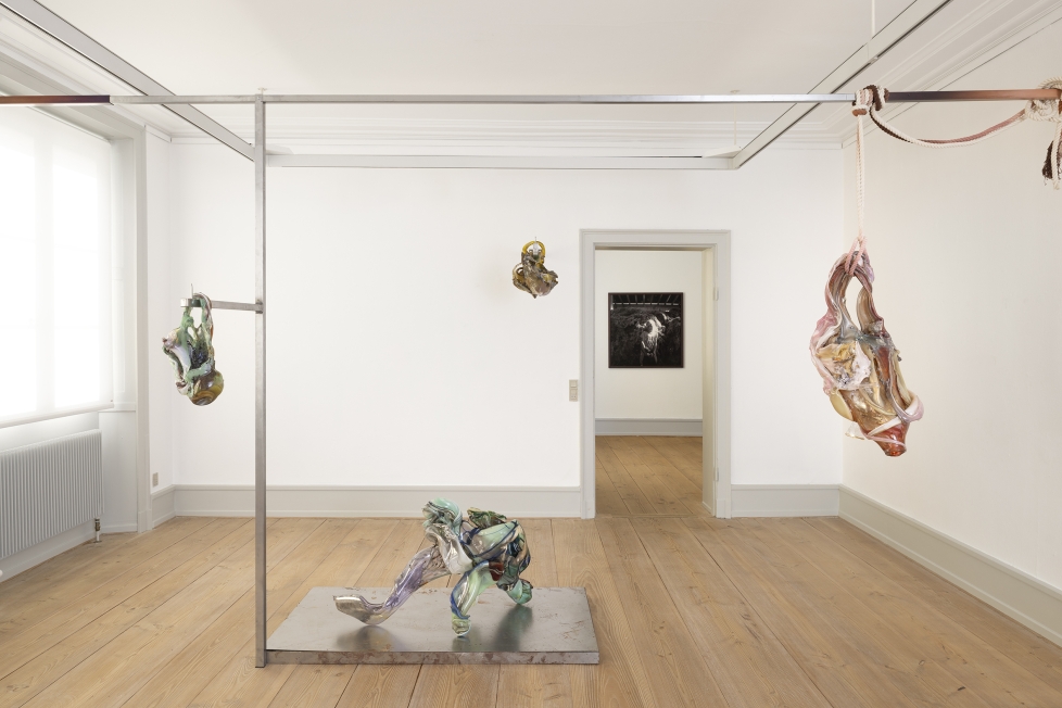 Bertram bidrager også med nogle fotografier af og omkring Magnussen, mens Jakob Sejerøe har tegnet et portræt af ham (og, skal det retfærdigvis siges, af de andre kunstnere i udstillingen). Maria Koshenkovas glasskulpturer har fået et rum, Astrid Specht Seebergs keramik har fået et kammer og lidt gangplads, og så er der en højttaler et sted, hvorfra Anna Miilmans operastemme fosser ud. Koshenkova og Seeberg lader til at deles med Magnussen om en hang til spraglet spontanitet og rustik folk-landlighed. Staldens og sagnets stemning hos den sidste, abstraktioner i farvet glas hos den første. Bjørn Magnussen har også lavet glasskulpturer, i Bertrams film ser man, hvordan det næsten går galt med noget glasskabelse – måske går det faktisk galt, men får i intuitionens navn lov at være meningen (hvilket jeg selvfølgelig ikke kan vide).