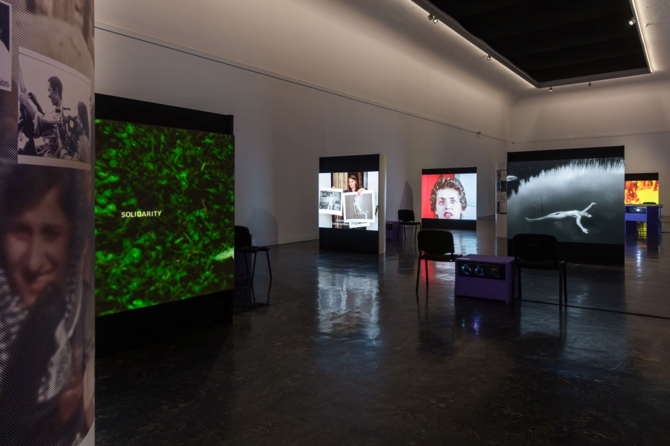 Installasjonsbilde fra utstillingen No Master Territories på Kunstnernes Hus. Midt i bildet: Mona Hatoum, So Much I Want To Say, 1983 Foto: Tor S. Ulstein, Kunstdok / Kunstnernes Hus.
