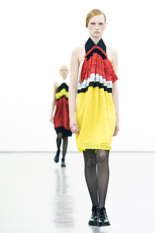 Det er tydelig at den lys grå fargen fra gallerigulvet ikke har havnet tilfeldig på «Mondrian»-kjolene. De klare maleriske og skulpturelle kvalitetene ved kolleksjonen kommer også spesielt godt frem i et rom som er beregnet på å fremheve slikt. Stedet åpnet også for en annen koreografi enn før. I stedet for å bruke et podium, gikk modellene rett på gulvet, noe som gjorde dem mer til en del av rommet og ikke en slags opphøyde objekter. Befriende var det også at de beveget seg i takt med musikken og slik ble en del av den også, et enkelt og sterkt grep som overraskende få benytter på visninger. Totalt sett fungerte visningen, i motsetning til utstillingen, veldig godt i gallerirommet.
