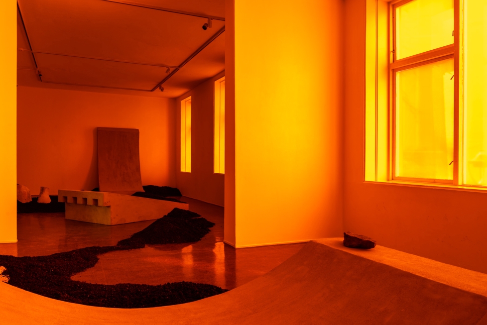 Farget folie klistret på vinduene i Kunstnerforbundets to øvre saler gjør at installasjonen Rivers End (2026) av Bianca Hisse og Christian Danielewitz bades i et oransje lys. Øynene mine venner seg raskt til dette filteret, og først opplever jeg den Olafur Eliassonske fargeleggingen som inviterende, men etter hvert som tiden går, framstår den omsluttende gløden gradvis mer faretruende, som om jeg er utlevert til en sol som ikke slutter å steke.
