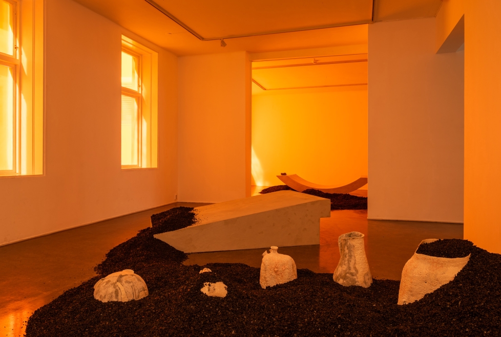 Tre store betongskulpturer – to bueformede og en rampelignende – er spredt utover lokalet, en av dem lent opp mot veggen. De ligner byggeelementer, men tatt i bruk ville de tålt mindre enn de ser ut til, ettersom kjernen er av isopor. På en av skulpturene ligger et plantefossil der bladene til en liten plante er blitt bevart i steinmassen. Betong lages av blant annet knust stein og mineraler, og det intakte fossilet blir en påminnelse om de andre fortidige fortellingene om livet på jorda som har gått tapt under utgraving eller utvinning – på grunn av menneskelig aktivitet og ekspansjon.