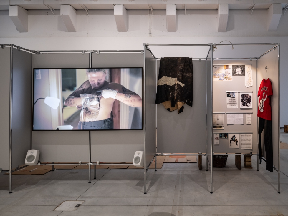 Att Sjöberg «använder sig själv som material», som det står i introtexten, håller jag däremot inte med om. Eller, det är sant att hon går in med hela sin person i sitt arbete, till exempel genom att tatuera sin kropp, men rörelsen mellan konst och liv sker primärt i den andra riktningen: till skillnad från autofiktion och liknande så för hon inte in sitt eget liv i sin konst, utan låter konsten och fiktionen infiltrera sitt liv, som får fungera som en arena för ett pågående arbete. Ett undantag är IVF-verken, som känns mer personliga. Samtidigt blir de en förevändning för en självkritisk intervention i form av tröjan I went to the IVF-clinic and all I got was this lousy t-shirt (2026), som man kan köpa med sig från konsthallens shop.